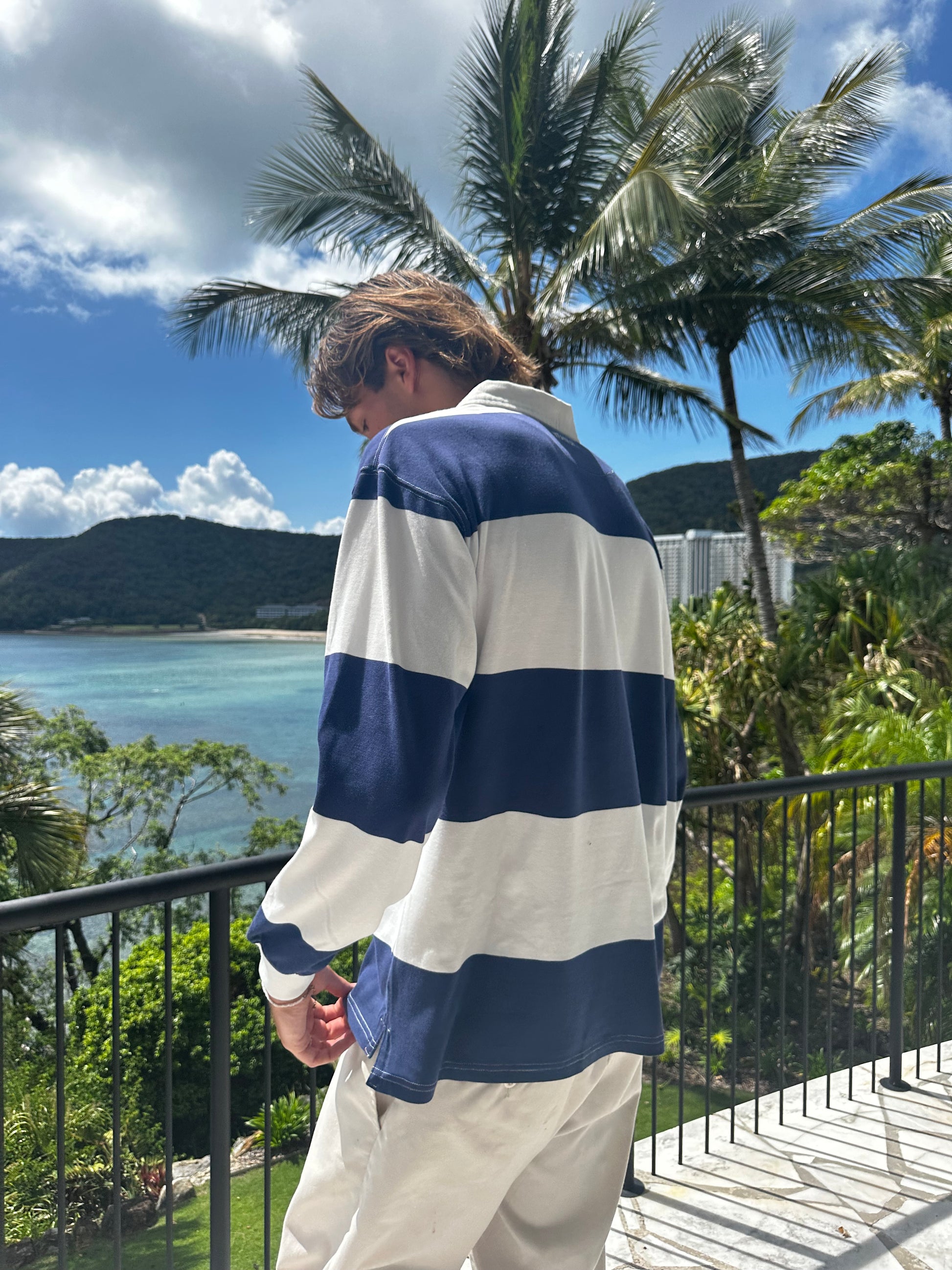 Our Stanlie Original Rugby in navy/white is the perfect staple for summer! The UNISEX style is designed to be worn and loved by all genders, creating an effortless style to be thrown on after beach days.